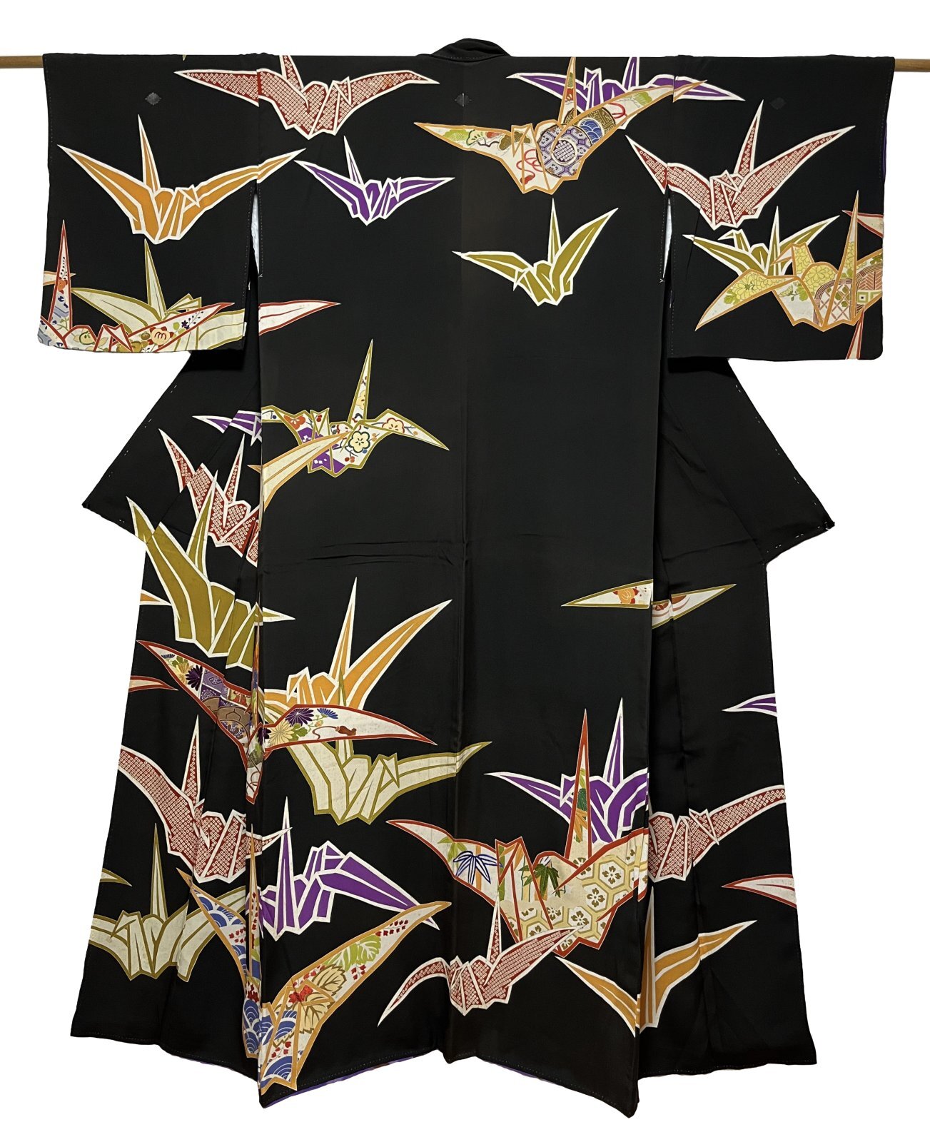 JAPANESE KIMONO SILK ANTIQUE HOUMONGI / ORIGAMI CRANE / EMBROIDERY / BLACK