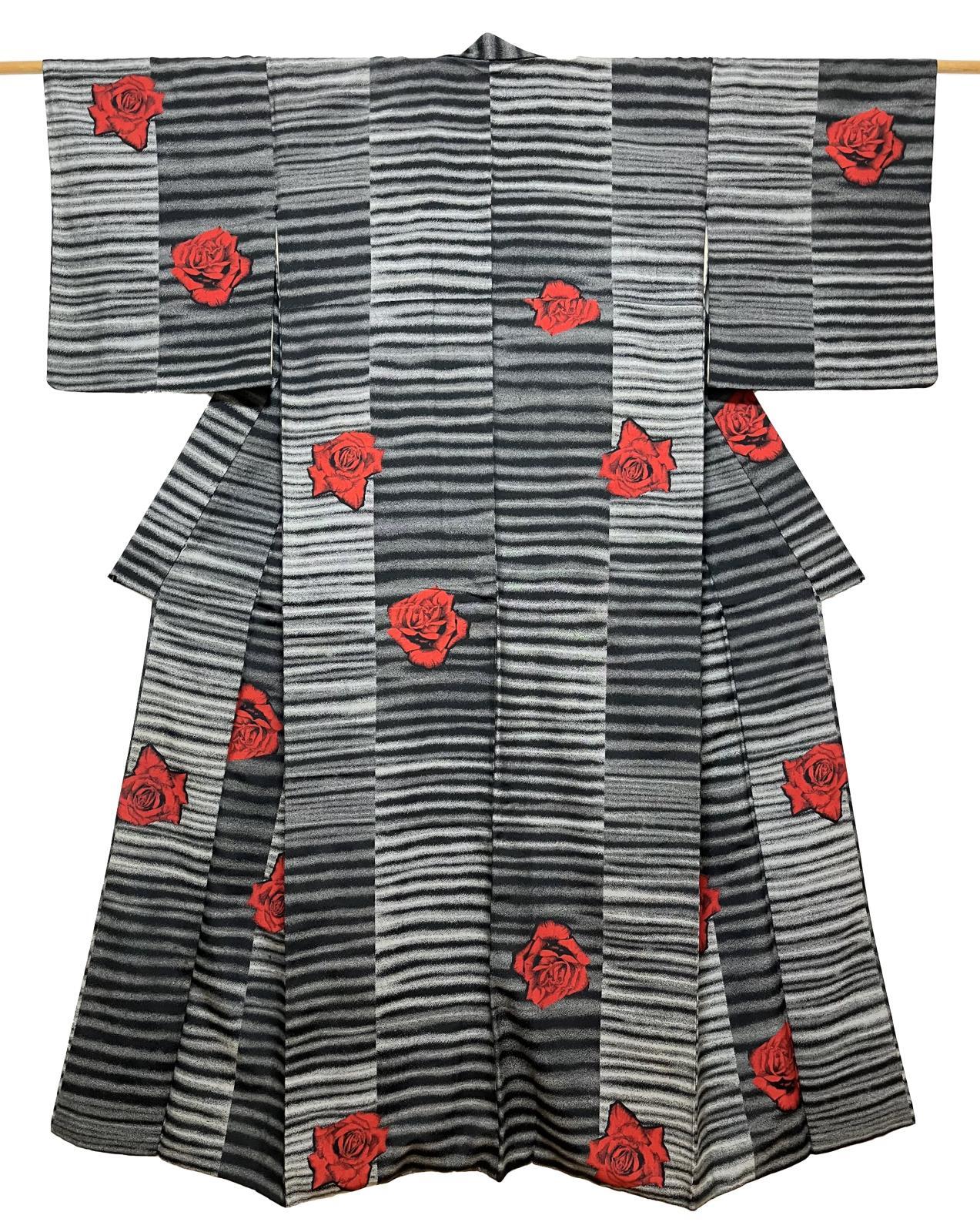 JAPANESE KIMONO SILK ANTIQUE OMESHI / ROSE / BLACK & RED