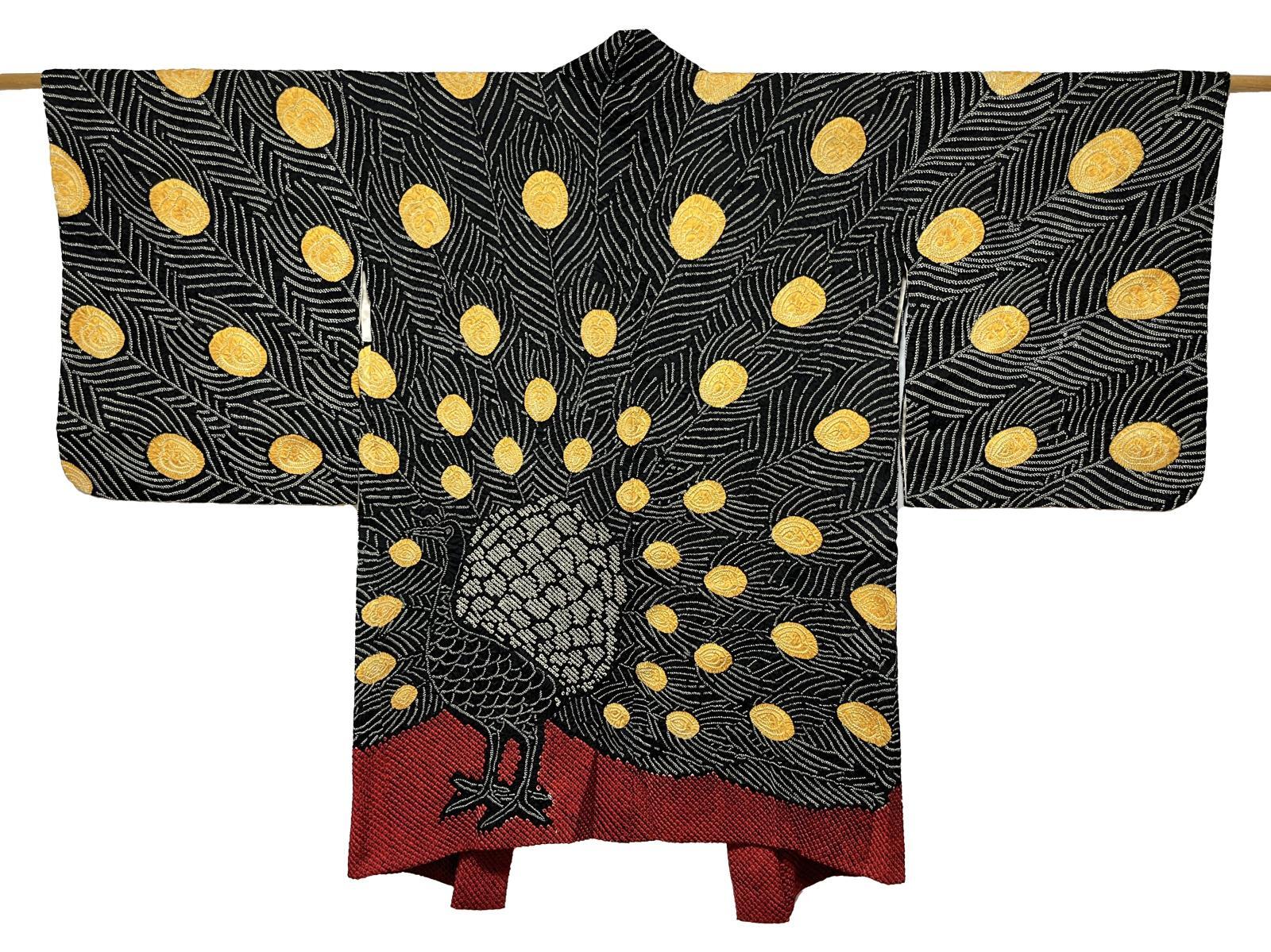 JAPANESE KIMONO SILK HAORI / FULL SHIBORI / PEACOCK / BLACK & RED