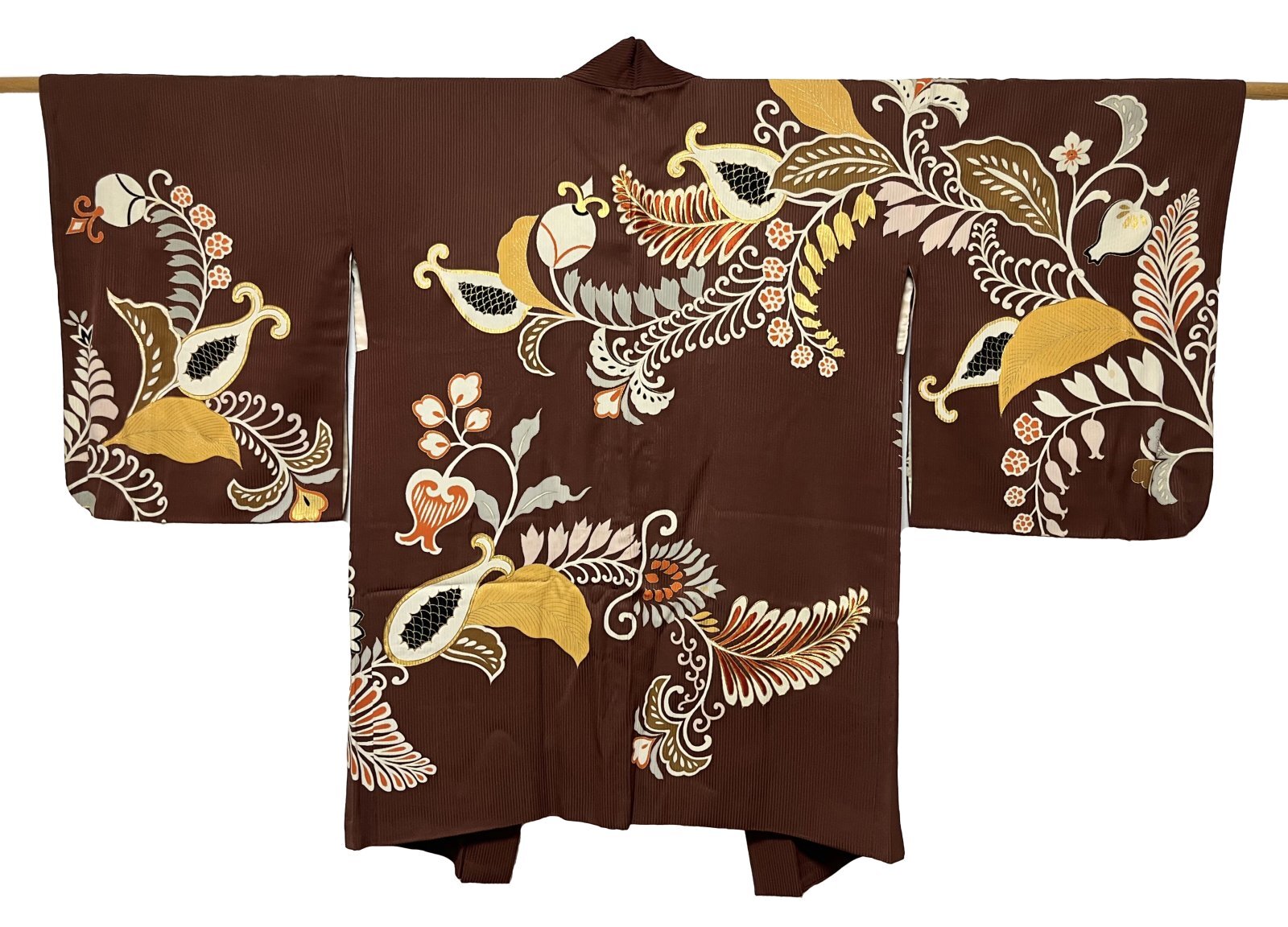 JAPANESE KIMONO SILK ANTIQUE HAORI / KARAHANA / DARK BROWN