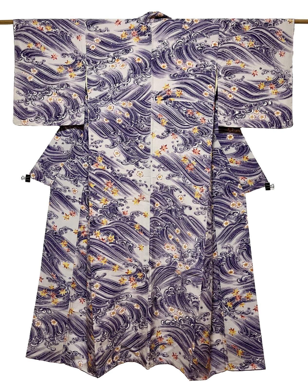 JAPANESE KIMONO SILK KOMON / WAVE & MOMIJI LEAVES / PURPLE