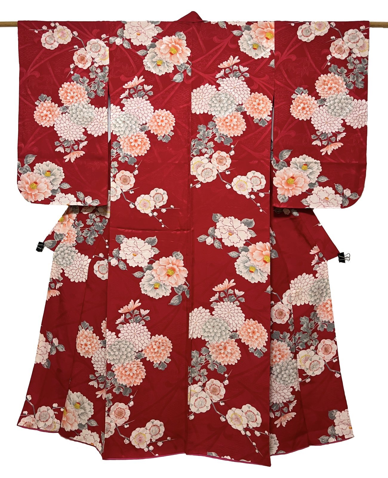 JAPANESE KIMONO SILK ANTIQUE KOMON / CHRYSANTHEMUM / CAMELLIA / UME / RED