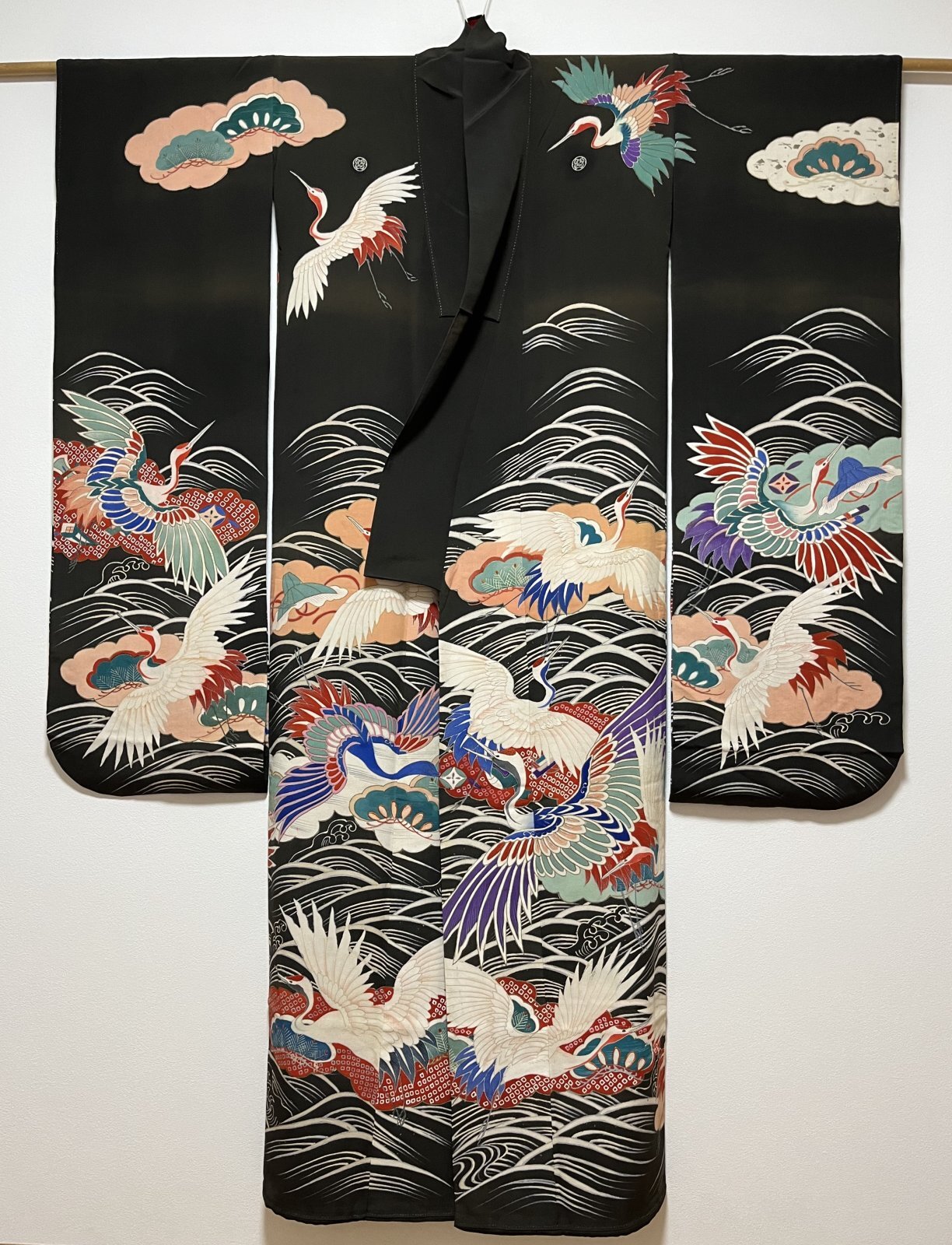 JAPANESE KIMONO SILK ANTIQUE FURISODE / FLYING CRANE / WAVE / TAKARAZUKUSHI