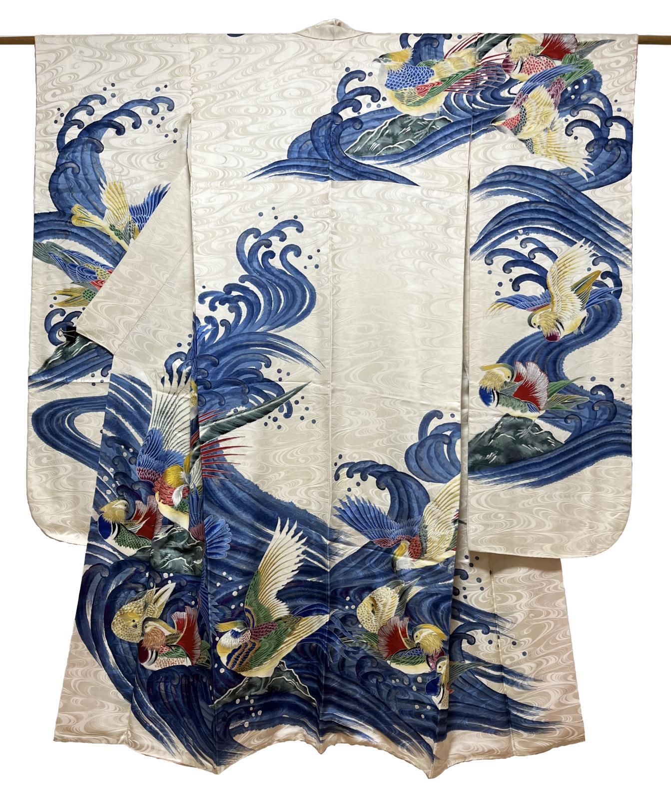 JAPANESE KIMONO SILK FURISODE / MANDARIN DUCK / WAVE / WHITE & BLUE