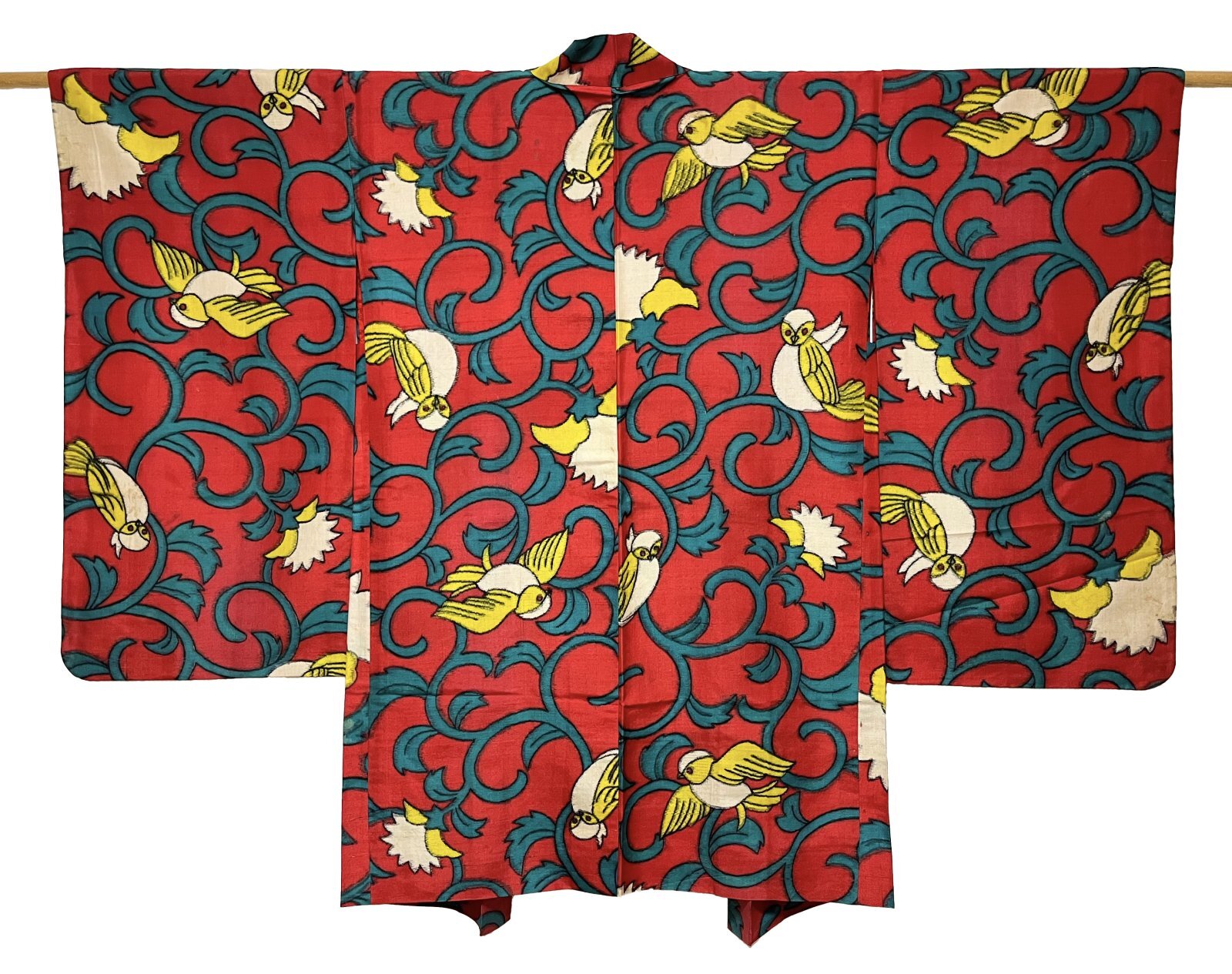 JAPANESE KIMONO SILK ANTIQUE HAORI / MEISEN / BOIRDS / RED & GREEN